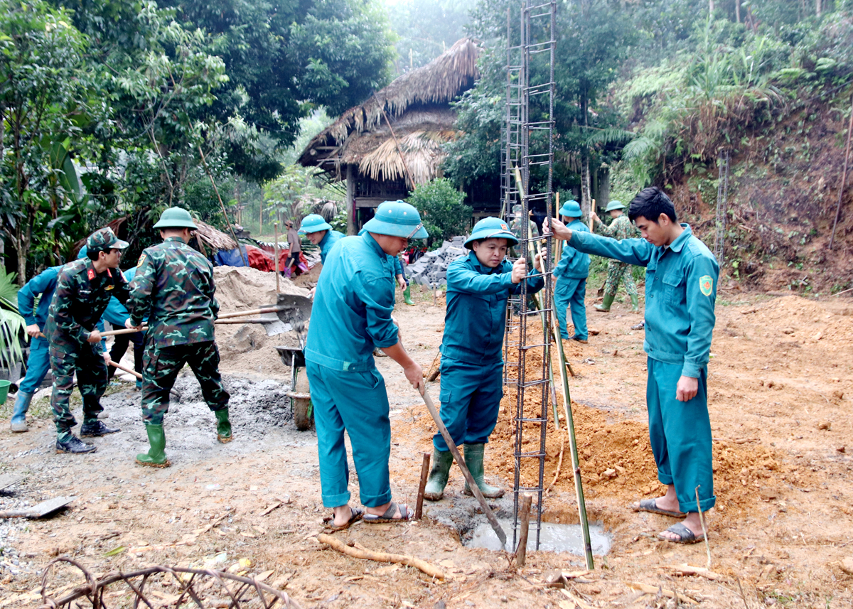 Cán bộ, đảng viên lực lượng vũ trang huyện Bắc Quang giúp gia đình bà Vũ Thị Nhình (xã Quang Minh) khởi công xây nhà mới.