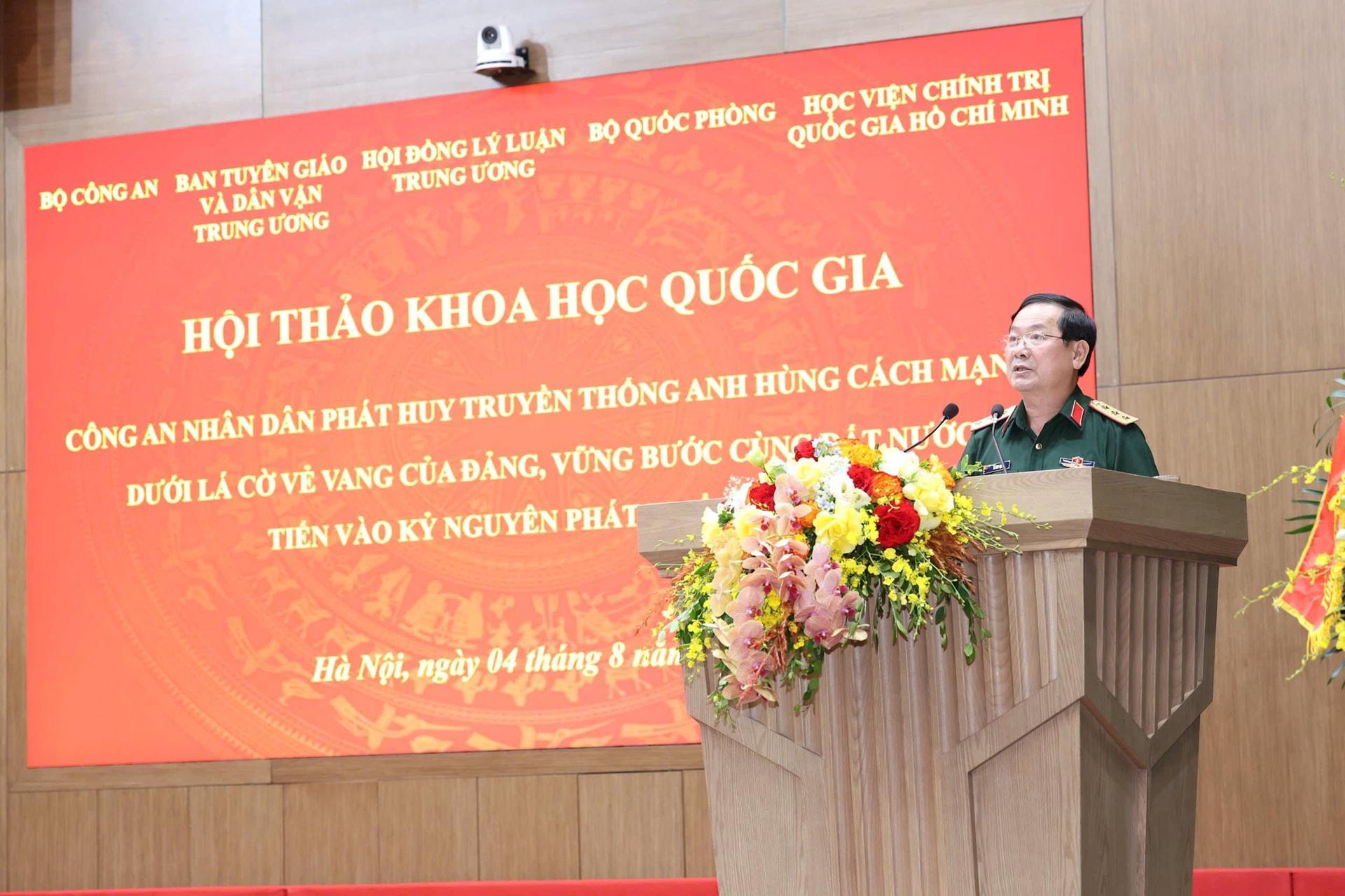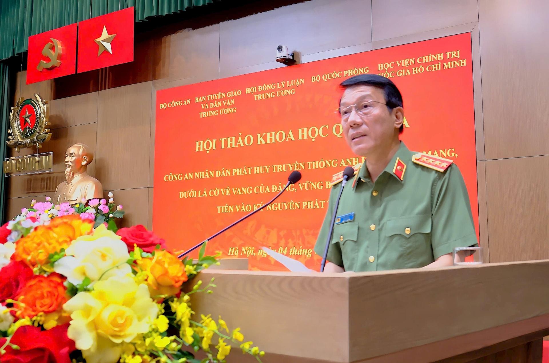 Tại Hội thảo, Bộ trưởng Bộ Công an đã đọc thư của Tổng Bí thư Tô Lâm gửi Hội thảo khoa học quốc gia nhân dịp kỷ niệm 80 năm Ngày truyền thống Công an nhân dân Việt Nam (19/8/1945 - 19/8/2025) và 20 năm Ngày hội Toàn dân bảo vệ an ninh Tổ quốc (19/8/2005 - 19/8/2025), trong thư có đoạn: “Hội thảo là sự kiện khoa học - chính trị có ý nghĩa đặc biệt quan trọng, góp phần khẳng định tầm vóc, vai trò và sứ mệnh lịch sử của lực lượng Công an nhân dân Việt Nam trong sự nghiệp cách mạng vẻ vang của Đảng và dân tộc. Chặng đường 80 năm qua, dưới sự lãnh đạo tuyệt đối, trực tiếp, toàn diện của Đảng, được Bác Hồ kính yêu tổ chức, giáo dục và rèn luyện, lực lượng Công an nhân dân không ngừng trưởng thành, lớn mạnh, luôn là “lá chắn thép”, “thanh bảo kiếm” sắc bén, bảo vệ Đảng, bảo vệ Nhà nước và Nhân dân, “chỉ biết còn Đảng là còn mình”. Trong dòng lịch sử ấy, mỗi chiến công, mỗi hy sinh của cán bộ, chiến sỹ lực lượng Công an nhân dân đều là biểu tượng cao đẹp của lòng trung thành, sự dũng cảm và tinh thần tận tụy phục vụ Nhân dân”.