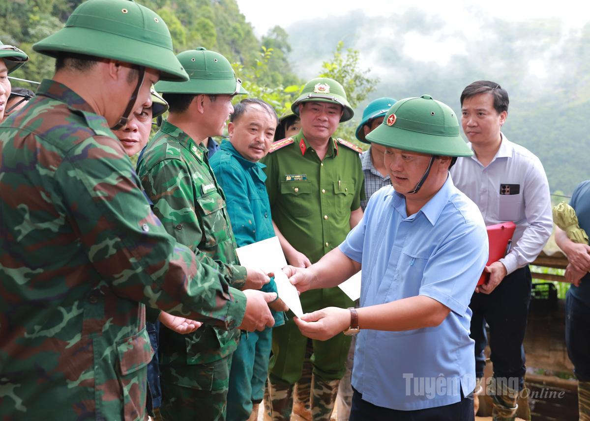 Bí thư Tỉnh uỷ Hầu A Lềnh tặng quà động viên các lực lượng tham gia tìm kiếm nạn nhân mất tích. |