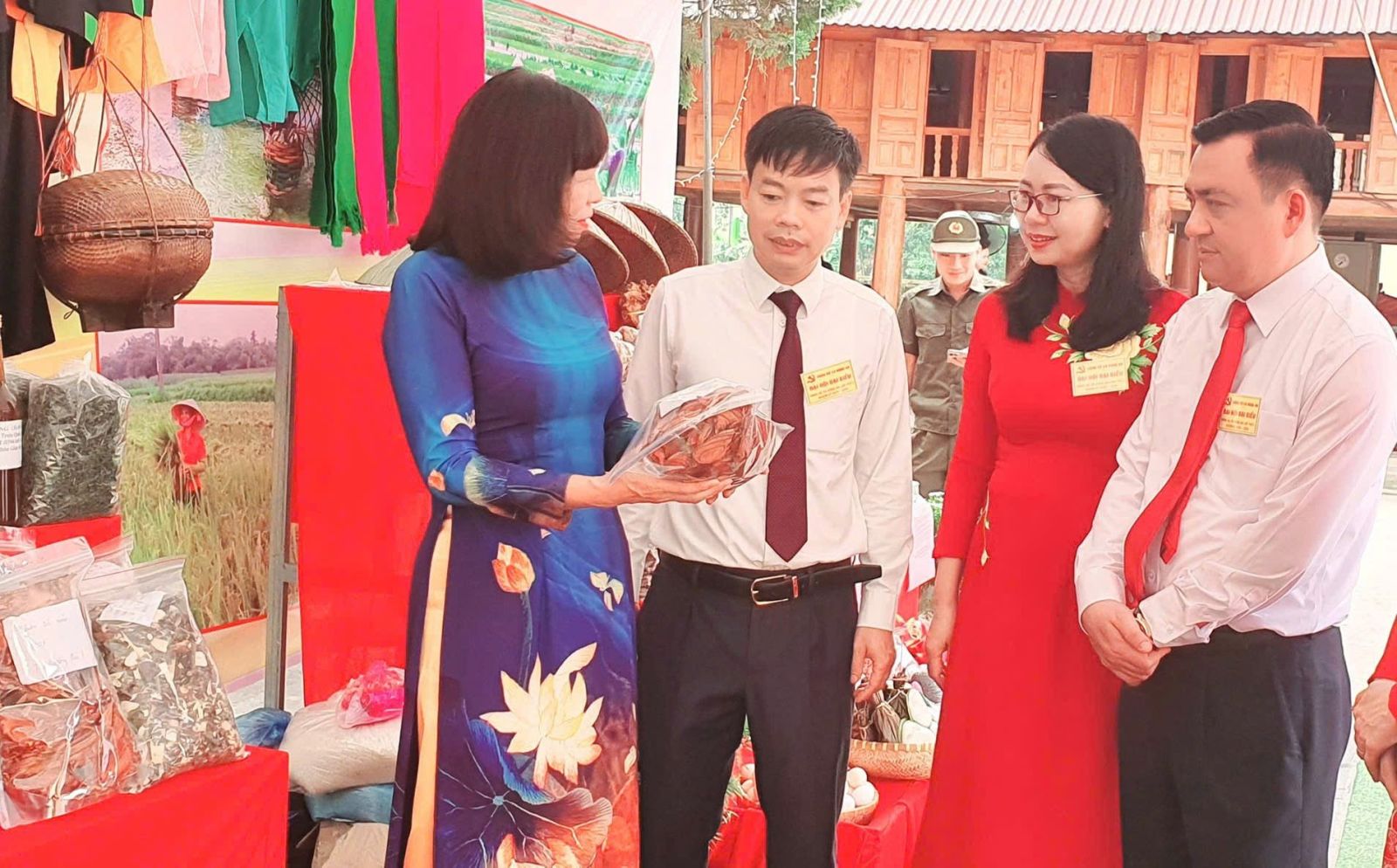 Đồng chí Phạm Thị Minh Xuân, Phó Chủ tịch Hội đồng nhân dân tỉnh và các đại biểu tham quan gian hàng nông sản đặc trưng của xã Hùng An