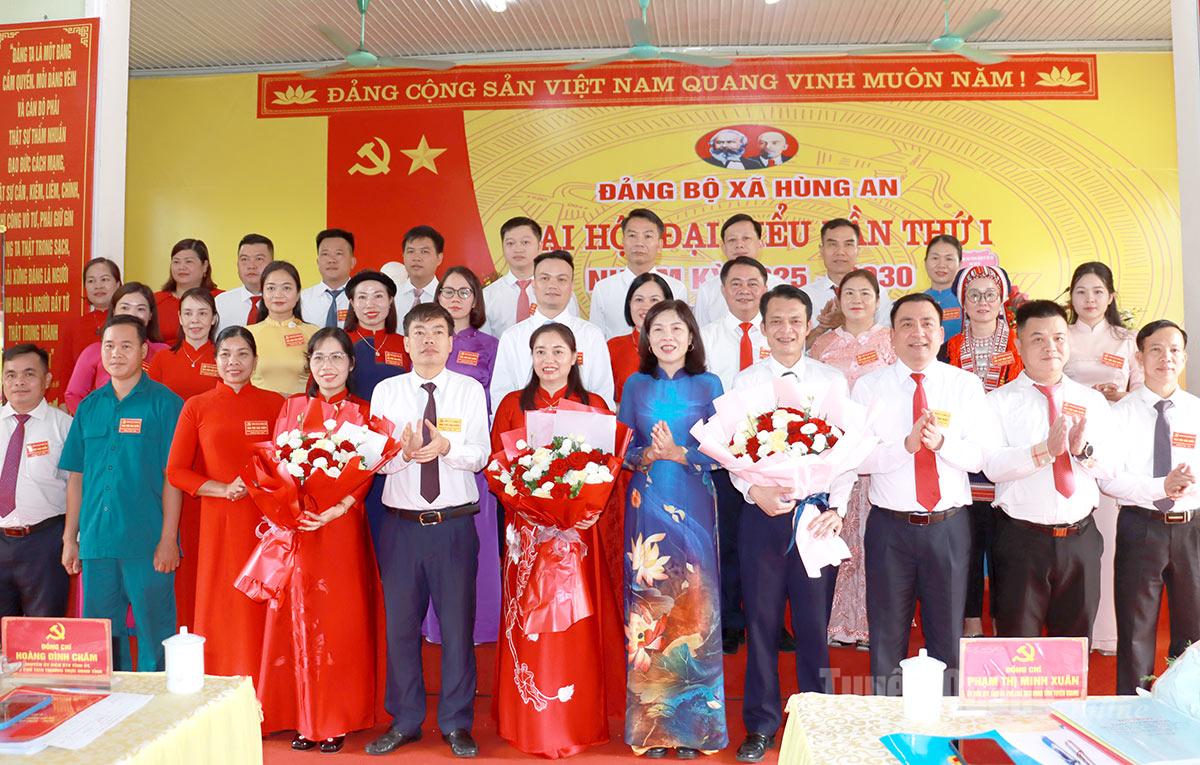 Các đại biểu tặng hoa chúc mừng Ban Chấp hành Đảng bộ xã Hùng An nhiệm kỳ 2025- 2030